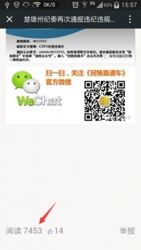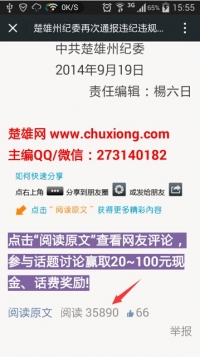楚雄州紀委于2014年9月23日在楚雄紀檢監察網全文通報州內13起“五一”、端午、中秋節以來違反中央八項規定精神和省州黨委實施辦法的典型問題,經微信公眾帳號轉載,截至9月25日,通過手機閱讀通報人數達43348人,展現了新媒體強大的宣傳實效,取得較好的警示震懾作用。(陳建祿)