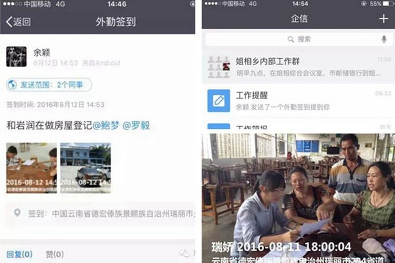 “軟件定位可精確了,再上傳幾張外出工作的照片,領導再也不用擔心找不到人了。最棒的是,我能看到他的報備情況,他也能看到我的,特別透明!”姐相鄉工作人員說起自己“被監督”的感受時十分激動。針對工作人員上班時間外出事由隨意且難以追蹤核實等問題,瑞麗市姐相鄉探索紀律監督新載體,要求全鄉干部職工在手機上安裝“紛享逍客”APP,建立“逍客”外勤簽到制度。一旦工作人員外出,需要通過手機GPS定位實時位置,再通過定位相機即時拍照,將時間、地點、人物、事由完整上傳方能簽到,有效杜絕部分干部職工無故不在崗的惡劣現象,讓“事假專業戶”、“鉆空小專家”無處遁形,自運用“逍客”管理模式以來,群眾口中的機關干部“李逍遙”已經不復存在。