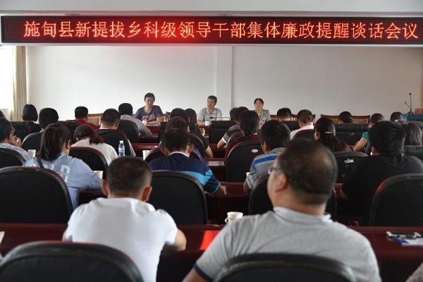 為深入貫徹落實全面從嚴治黨要求和中央《關于防止干部“帶病提拔”的意見》精神,執行好監督執紀“四種形態”,教育引導黨員干部挺起紀律和規矩,廉潔干事、清白做人,把黨章黨規內化于心、外化于行,施甸縣對新提拔的鄉科級干部進行任前廉政提醒談話,以談話“灌輸”黨章黨規,讓大家上任前都打好“防腐針”,提前敲敲警鐘、咬咬耳朵,為他們將來廉潔履職、干凈干事、邁好廉潔步伐奠定思想政治基礎。