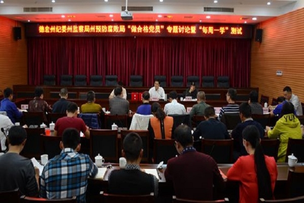 近日,德宏州紀(jì)委州監(jiān)察局州預(yù)防腐敗局開展“做合格黨員”專題討論暨“每月一考”,落實(shí)全員學(xué)習(xí)制度,采取隨機(jī)抽簽、脫稿回答的規(guī)定動作,圍繞“做合格黨員,在全面建成小康社會中擔(dān)當(dāng)有為”進(jìn)行了專題討論,并對“每周一學(xué)”內(nèi)容進(jìn)行了測試。州紀(jì)委副書記主持討論并“抽考”。