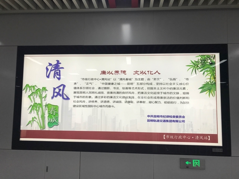 廉政文化主題站“市級行政中心·清風(fēng)站” 由“務(wù)實”“弘揚(yáng)”“傳承”“正氣”“中國健康之城——昆明”五個部分構(gòu)成,深入挖掘昆明文化中的廉潔元素,將人文景觀、書畫作品、廉潔典故、詩詞賦聯(lián)、家規(guī)家訓(xùn)等融入其中,依托站廳及四條出入通道口的空間以及179個廣告燈箱和LED電子屏為載體進(jìn)行宣傳,讓市民在不經(jīng)意間接受廉潔文化熏陶。