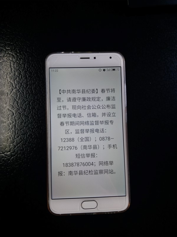 打好“預防針”。“春節將至,請遵守廉政規定,廉潔過節。現向社會公眾公布監督舉報電話、信箱,并設立春節期間網絡監督舉報專區……”這是南華縣紀委在下發嚴明元旦春節各項紀律規定后,提前向全縣黨員干部發出的春節“慰問”短信,提前預警并暢通監督舉報渠道。