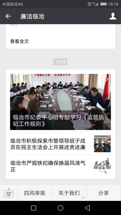 “廉潔臨滄”微信公眾平臺,設置了“四風舉報”“公示公告”“監督執紀”“廉政文化”“理論指導”等欄目,綜合運用文字、圖片、視頻等多種形式,第一時間刊發中央、省、市、縣紀檢監察工作動態,及時發布廉政新規、廉政提醒、廉政新聞、廉政告知等內容。通過廉潔宣傳教育,努力營造以廉為榮、以貪為恥、風清氣正的政治生態環境,傳導正風反腐正能量,推進實現廉政宣傳教育廣覆蓋、常態化。同時,微信公眾平臺設有“四風舉報”等內容,并開發了專門的后臺,由市紀委相關部門專人管理,積極回應社會關切。公眾號信息發布嚴格遵守層級審批制度,由市紀委宣傳部專人負責運行維護。