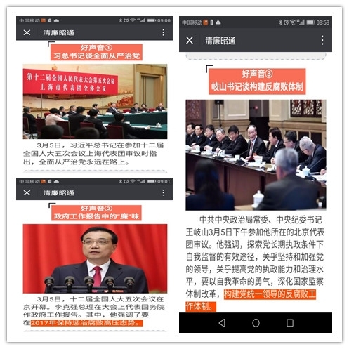 日前,昭通市紀委通過市紀委監察局網站、“清廉昭通”官方微信公眾號以及紀檢監察干部職工QQ群、微信群等平臺和渠道,第一時間轉播、轉載 “兩會”動態和資訊,及時傳遞高層反腐決策,受到全市紀檢監察系統干部職工的廣泛關注。大家在看“兩會”的同時,積極議“兩會”正風反腐“好聲音”,在紀檢監察系統內掀起了一股學習“兩會”精神的熱潮。