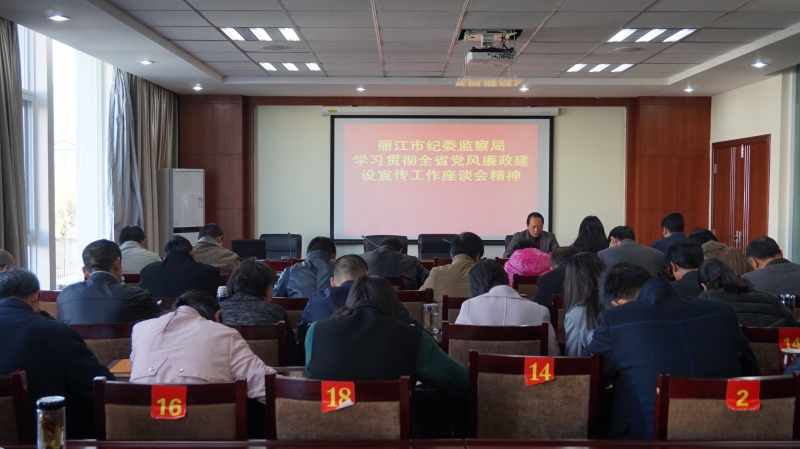 近日,麗江市紀委監察局召開干部職工學習會議,專題傳達學習全省黨風廉政建設宣傳工作座談會暨業務培訓班精神。會議原文傳達了省委常委、省紀委書記陸俊華在全省黨風廉政建設宣傳工作座談會上的講話,組織學習了全省2017年黨風廉政宣傳工作各項任務。對全市2017年黨風廉政宣傳工作進行安排部署。