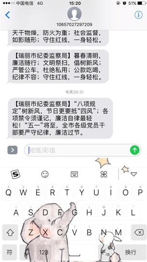 “‘八項規定’樹新風、節日更要抵“四風”,各項禁令須謹記,廉潔自律最輕松!五一將至,全市各級黨員干部要嚴守紀律,廉潔過節。”4月24日,瑞麗市紀委給全市副科級以上領導干部編發廉政提醒短信,提醒黨員干部“五一”過廉節,守廉潔。