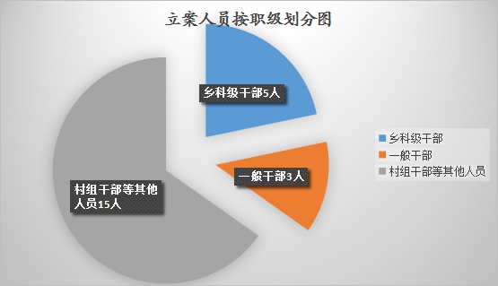 從立案人員的職級來看,上半年共立案審查19件23人,其中鄉科級干部5人,一般干部3人,村組干部等其他人員15人。