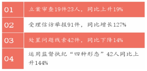 從紀律處分情況來看,上半年共立案審查19件23人,結案6件10人,黨紀政務處分10人,其中黨紀處分9人,政務處分1人。