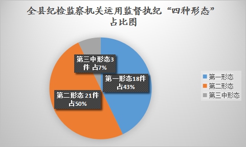從監督執紀“四種形態來看”,上半年全縣紀檢監察機關運用監督執紀“四種形態”處理42人次,同比增長144%,其中,第一種形態處理18人次,占“四種形態”處理總人數的43%;第二種形態21人次,占“四種形態”處理總人數的50%;第三種形態3人次,占“四種形態”處理總人數的7%,第一、二種形態39人,占93%,達到了懲治極少數、教育大多數的目的。