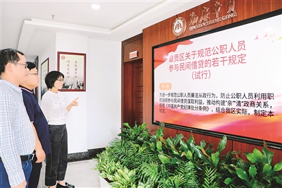 江西省贛州市章貢區(qū)紀(jì)委監(jiān)委開展公職人員違規(guī)借貸問題專項治理,并出臺《章貢區(qū)關(guān)于規(guī)范公職人員參與民間借貸的若干規(guī)定(試行)》,明令禁止公職人員利用職權(quán)違規(guī)參與民間借貸謀利,厘清公職人員與管理和服務(wù)對象交往界限。圖為該區(qū)紀(jì)委監(jiān)委干部在學(xué)習(xí)討論規(guī)定。廖寶豐 攝