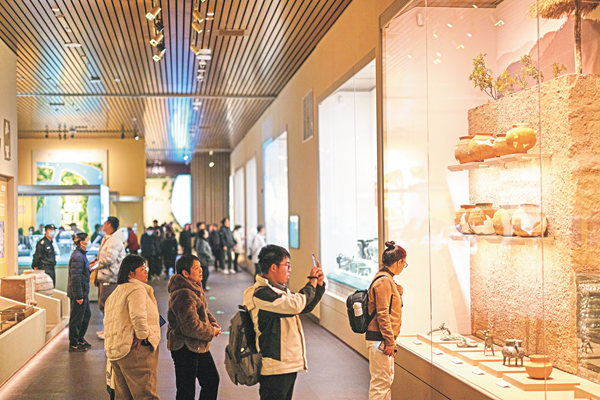 近日,殷墟博物館新館開(kāi)館。青銅器、陶器、甲骨、玉器等近4000件套文物在該館集中公開(kāi)展示,展陳文物數(shù)量之龐大、類(lèi)型之齊全,都是商代文物展覽之最,展現(xiàn)了一幅恢宏壯闊的中華早期文明畫(huà)卷。圖為觀眾在該館參觀。 圖片來(lái)源:視覺(jué)中國(guó)