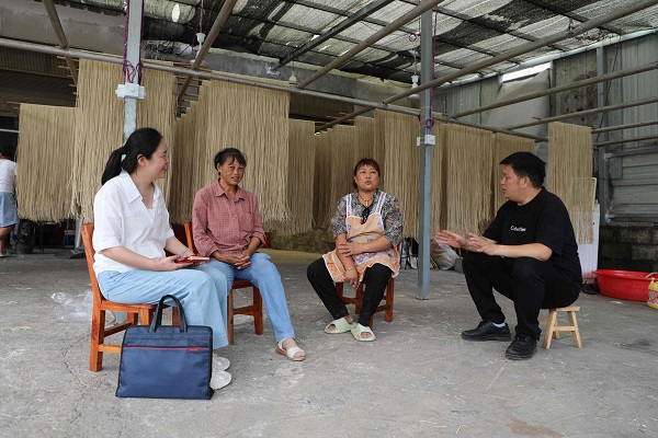 圖為喻澤偉(右一)正在走訪群眾,收集問題線索。張丹 攝